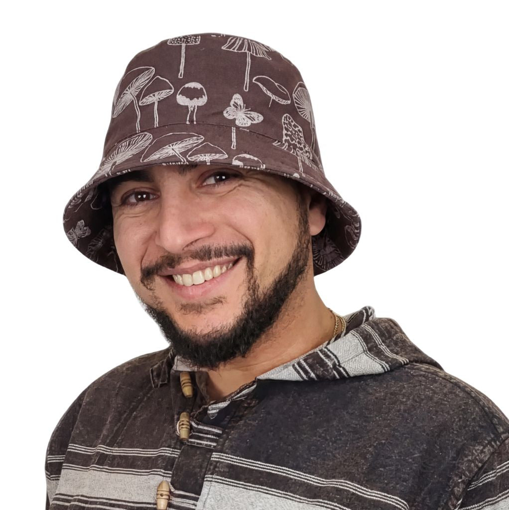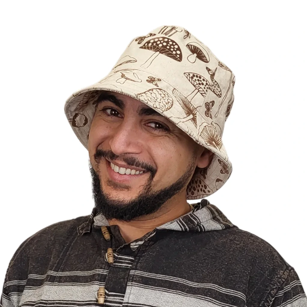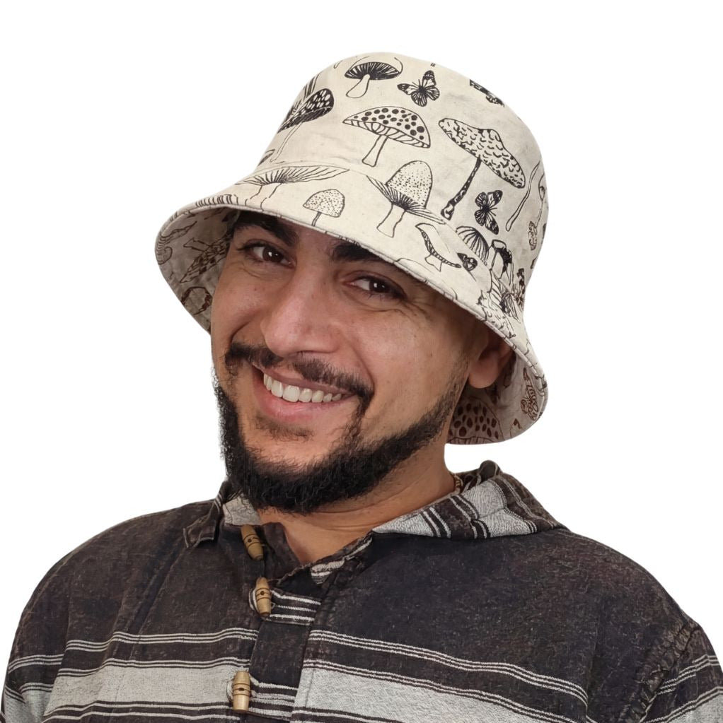 The Amsterdam Bucket Hat blends bohemian charm with practical style. Crafted from breathable 100% cotton canvas, it features a wide, flexible brim and a unique mushroom print. Ethically handmade in Nepal, this fair-trade hat is perfect for festivals, outdoor adventures, or everyday casual wear.