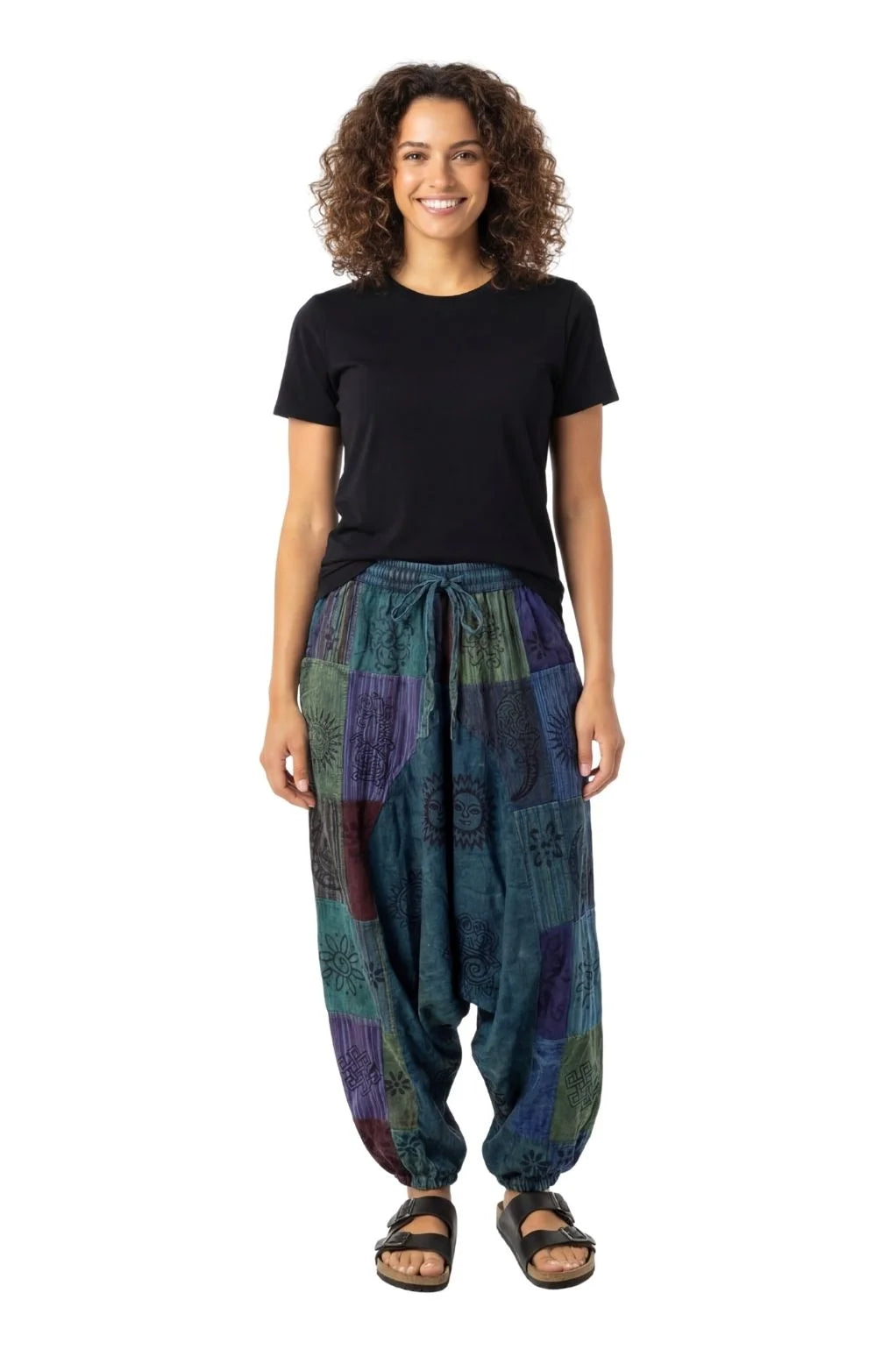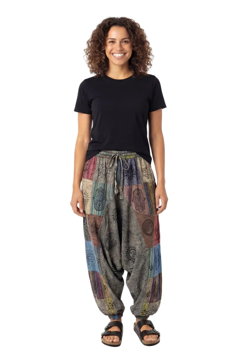 Finished with patchwork side panels and hand-printed symbolic motifs, these pants blend comfort with distinctive character. An elastic waistband and elasticized cuffs provide a flexible, comfortable fit. Available in green, burgundy, blue, and black.