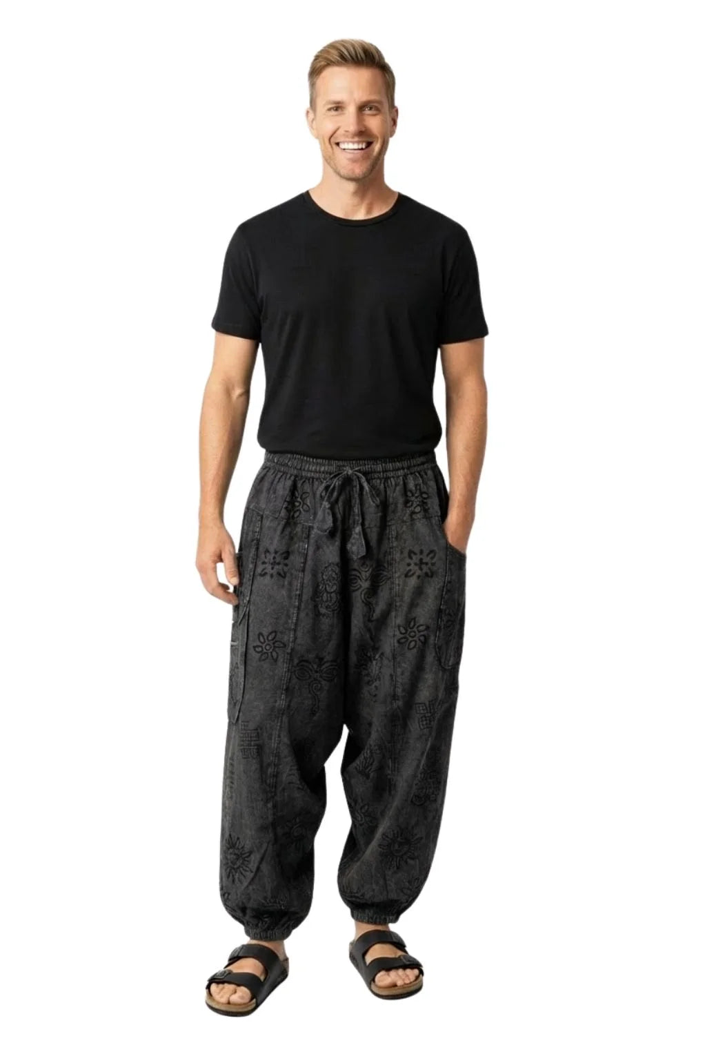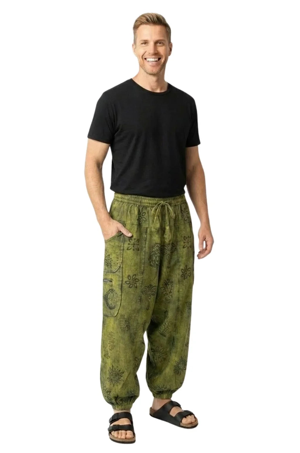 Crafted by Nepalese artisans under fair trade principles, each pair features unique traditional prints. The elastic waistband with drawstring offers a custom fit, while side cargo pockets add practical storage.