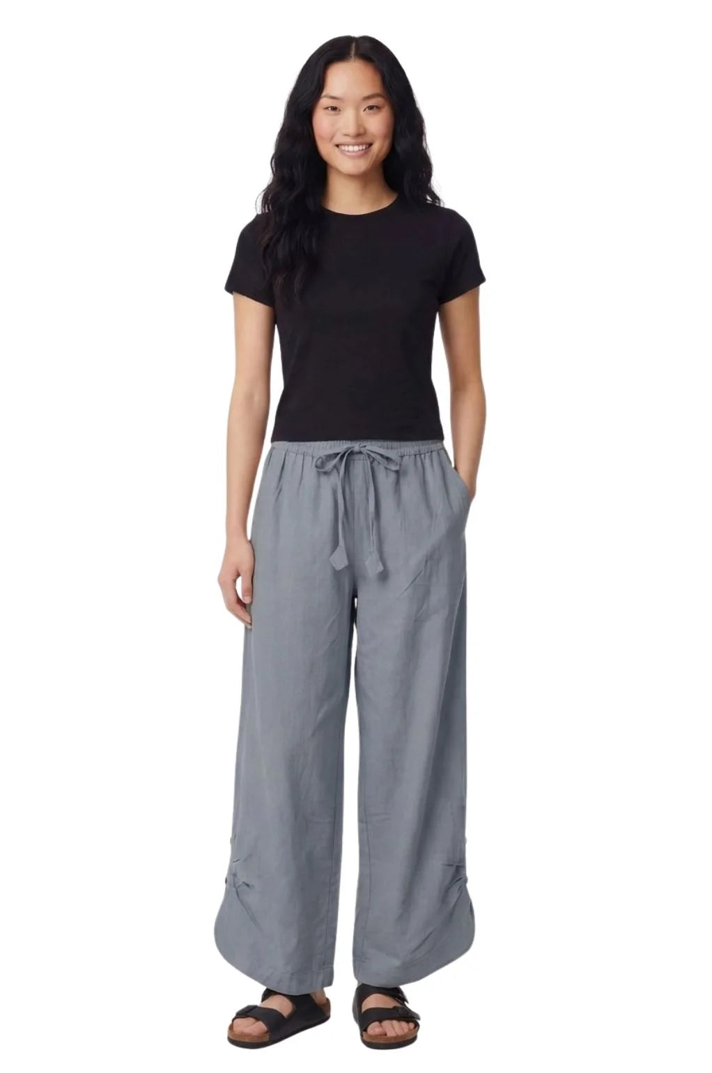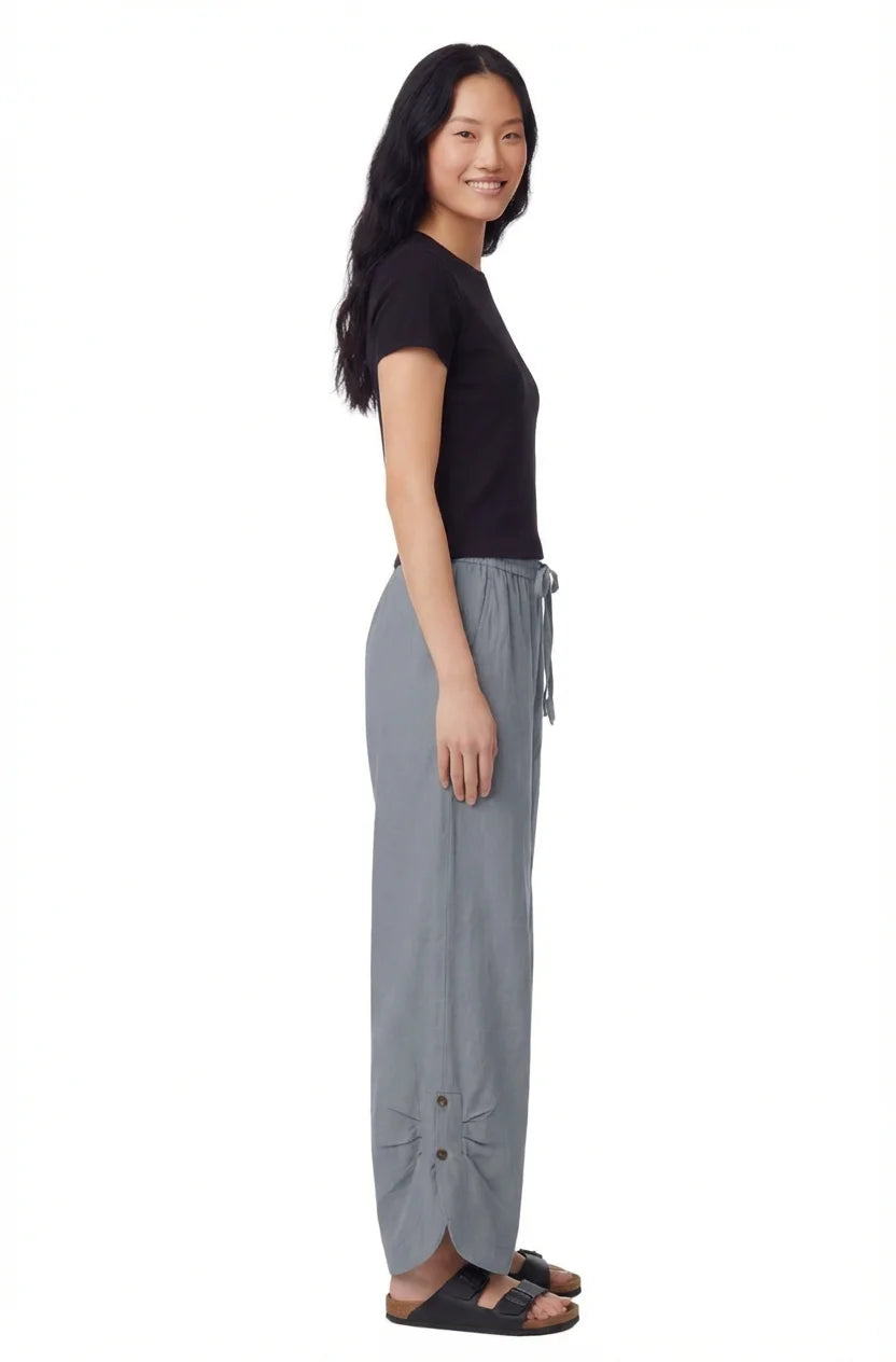 Designed with an elastic waistband and adjustable drawstring, these pants offer a flexible fit, while the buttoned side slit detail at the hem adds a unique, feminine touch. Available in natural, black, sky, and olive, and offered in three sizes.